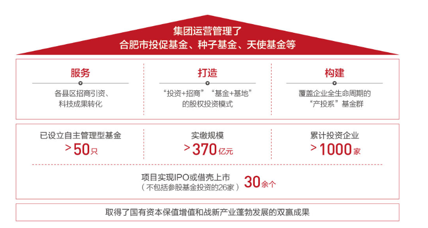 集团出资设立合肥市创业投资引导基金有限公司,担当合肥市创业投资引导基金的管理人。重点投资合肥市优势主导产业、战略性新兴产业,吸引国内外优秀股权投资机构进驻合肥,着力将全球资源嫁接于我市重点产业,构建覆盖企业种子期、初创期、成长期和成熟期的多元化股权投资基金体系。