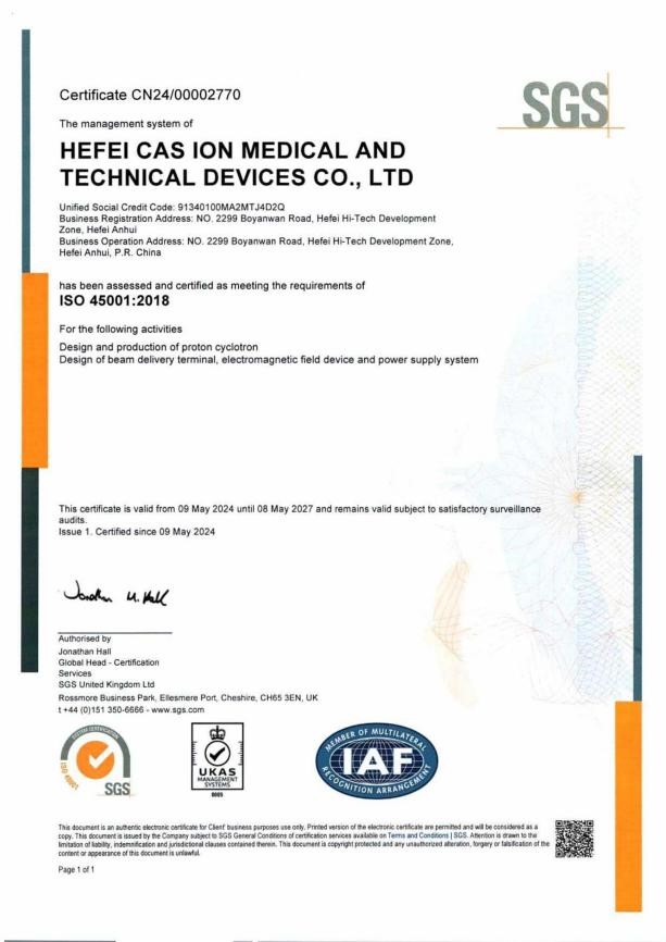 此次认证范围包含质子回旋加速器的设计与生产、束流配送终端、电磁场设备和电源系统的设计,表明中科离子的管理体系在制度化、规范化、精细化方面迈上新台阶。中科离子将以此为起点,切实推进各项管理体系有效运行,不断提高员工环境意识和健康安全意识,为“打造国际一流核能医疗设备研发与制造中心”的目标而努力,为客户提供更优质的服务。