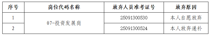 另根据公告的相关规定,因07-投资发展岗候选人放弃体检考察和递补,经研究决定取消该岗位的招聘。