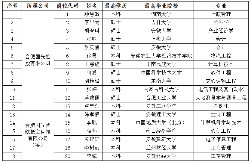 按照《合肥国先控股有限公司及子公司2025年社会招聘》公告要求及《合肥产投集团员工招聘管理办法》规定,经资格审查、笔试、面试、体检考察等程序,现将拟录用人员公示如下: